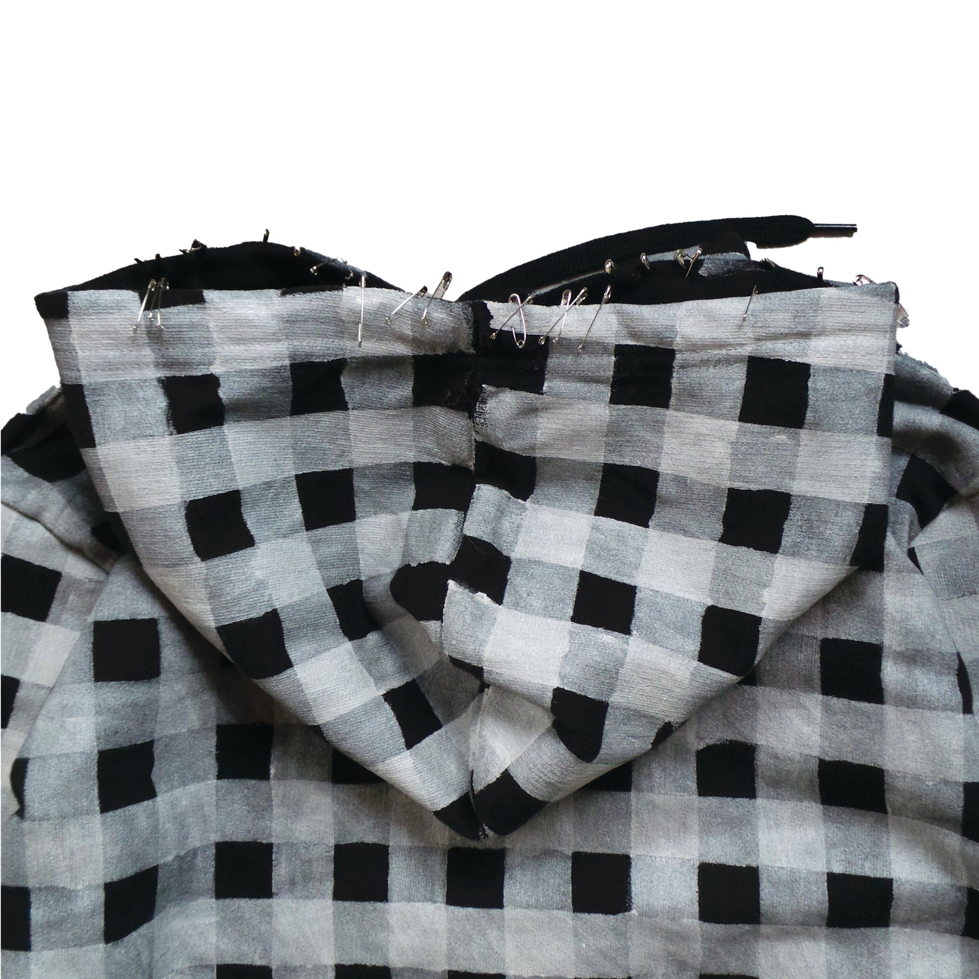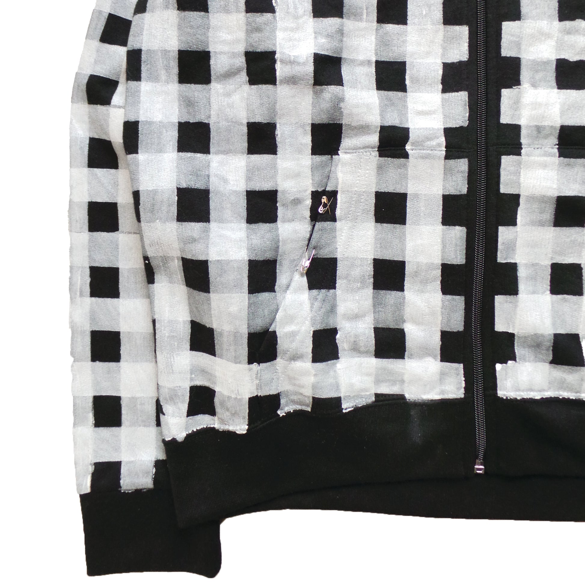 Unisex one of one Hand painted plaid print zip up hoodie sweatshirt. Features a paperclip adorned hood.