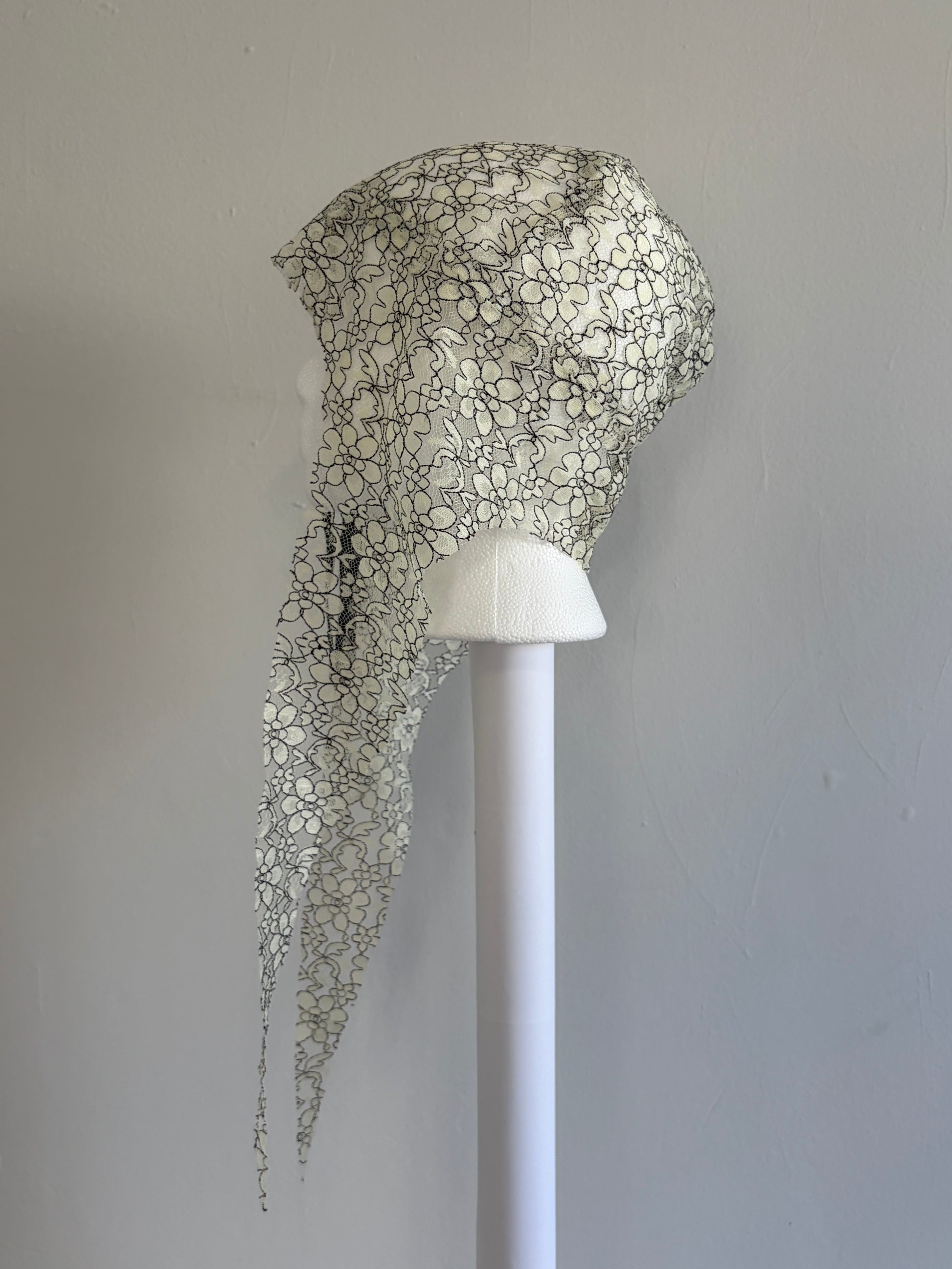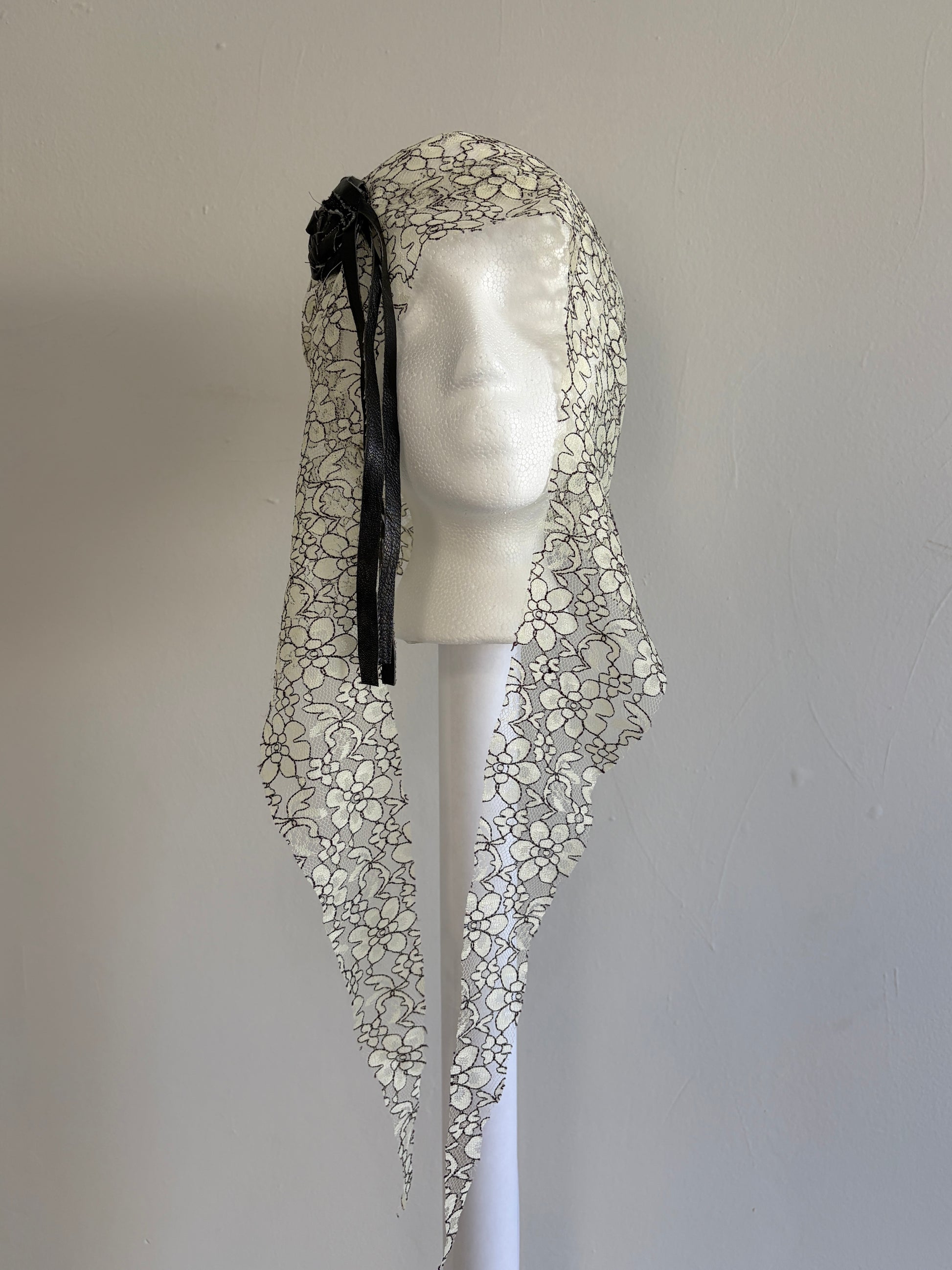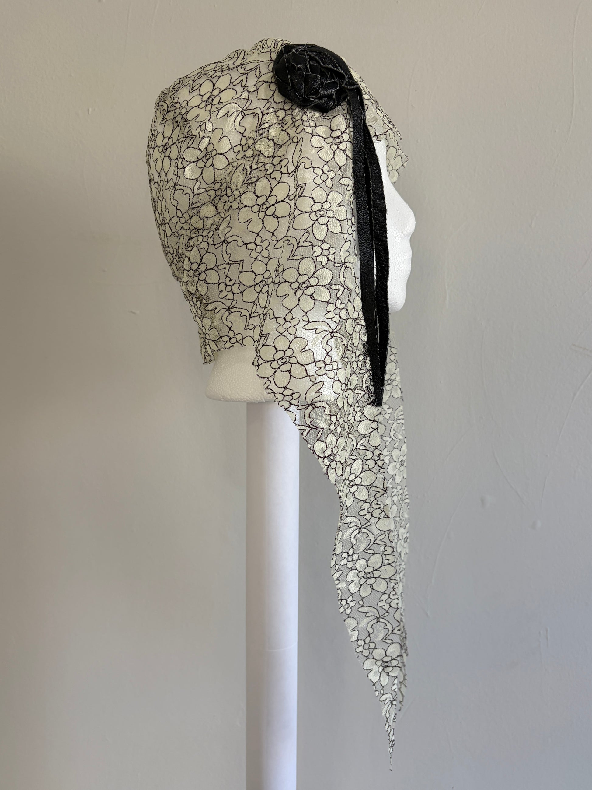UNISEX BLACK AND WHITE FLORAL LACE DRAPED LIGHTWEIGHT HAT WITH BLACK LEATHER BRAIDED ROSETTE AND ELONGATED FABRIC TIES. DESIGNED TO DRAPE CLOSE TO THE HEAD TO CREATE A SUBTLE VEIL EFFECT.